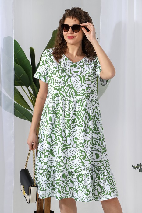 Платье из трикотажного полотна «кулирка» с набивным рисунком, отрезное по талии, с короткими втачными рукавами, горловиной V-образной формы, окантованной основным материалом и карманами в боковых швах. Полочка – с рельефами, выходящими из плечевых швов. Входы в карманы окантованы. Юбка – широкая, присборенная по шву стачивания с лифом и оборкой по низу.