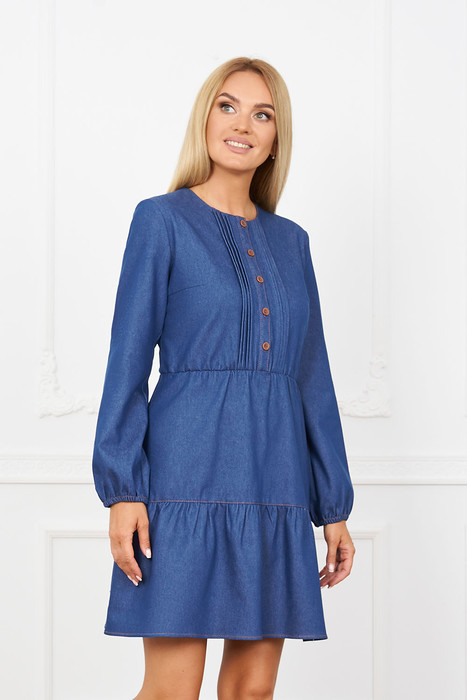 Платье женское из джинсовой ткани. Отрезное по линии талии, с расширенным низом с воланами, вырез горловины-полукруглый, застежка спереди на планку с пуговицами, по линии талии вставлена эластичная тесьма.