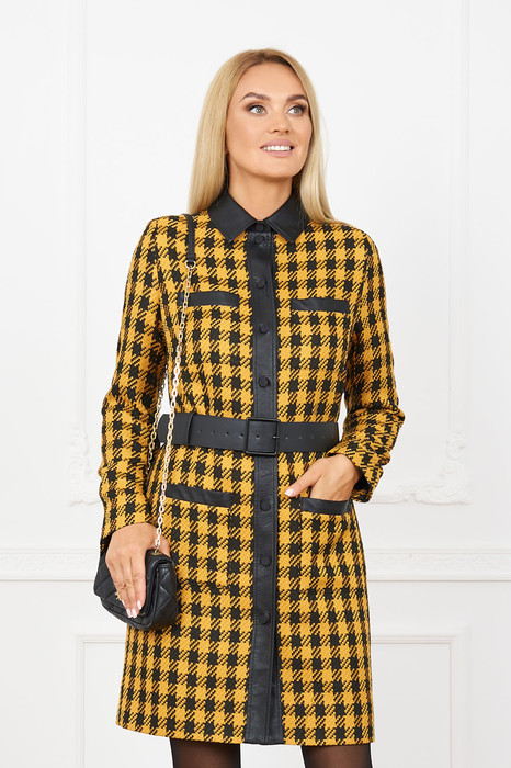 Платье  женское из ткани с отделкой из кожзаменителя на хлопчато-бумажной основе, полуприлегающего силуэта с втачным рукавом, с застежкой спереди на планку с пуговицами, с отложным воротником на стойке, с накладными карманами по переду выше линии груди и на линии бедер, под пояс съемный из кожзаменителя. Изделие на подкладке.