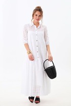 Платье женское летнее, комбинированное из двух видов ткани: вышивки и однотона. Свободного силуэта, расширенное книзу, вырез горловины-полукруглый, рукав спущенный цельнокроенный, застёжка спереди на планку с пуговицами, по переду карманы со скосом, изделие частично на подкладке.