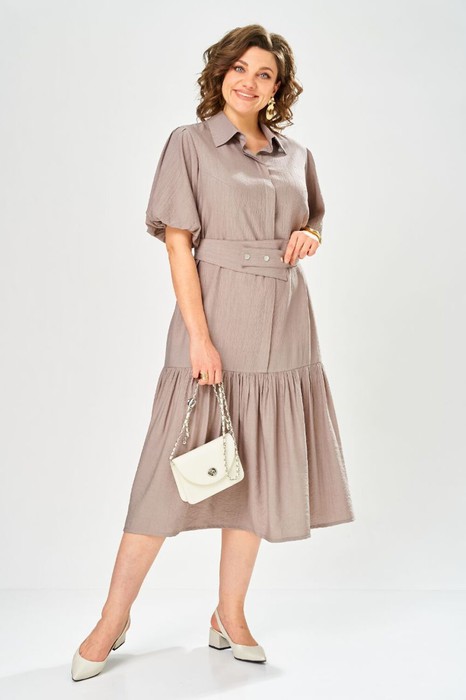 Женское платье свободного силуэта, длиной ниже середины икры с объемными рукавам-буфами , выполнено из плательно-костюмной ткани с эффектом жатости. Платье с центральной потайной застёжкой на петли и пуговицы ,и отложным воротником-стойкой и воланом по низу. Перед с нагрудными вытачками из пройм. Спинка цельная. Рукава втачные, одношовные,со сборкой по окату и низу,на подкладке из основной ткани. Платье укомплектовано поясом с резинкой и застёжкой на кнопки, из основной ткани.