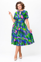 Платье женское полуприлегающего силуэта двухслойное. Прилегание достигается за счет нагрудных вытачек и талиевых по спинке. Застежка молния по спинке. Верхняя часть платья из шифона с притачной контрастной планкой по всей длине. Спереди короче, по спинке длиннее. Платье украшено съемной брошью. Длина изделия- 105 см, накидки спереди- 57 см, по спинке- 74 см.