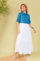 Платье женское прямого силуэта с разрезами в боковых швах. Прилегание достигается за счет нагрудной выточки и талиевой по спинке. Рукав втачной короткий, перед и спинка украшены отрезными цветными полосками. В комплект идет сьемный пояс