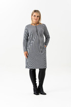 Эйлера – утончённое платье прямого силуэта на любой случай. Рукав втачной 3/4, с воланом из легкой ткани в горошек. Горловина круглая, обработана той же тканью, что и волан на рукаве, регулируется завязкой в цвет. Платье Эйлера декорировано украшением ручной работы – жемчужными и черными стразами.