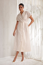 Фольяно – легкое платье прямого силуэта из плательной ткани с принтом. Вырез горловины классический овальный, декорирован обтачкой контрастного оттенка. Рукава цельнокроеные, декорированы широкими манжетами. Спереди на кокетке – декоративные пуговицы. В комплекте с платьем поставляется декоративный пояс. Привлекайте внимание и чувствуйте себя настоящей королевой вместе с "