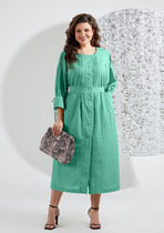 Элегантное женское платье выполнено из хлопка с содержанием эластана. Платье полуприлегающего силуэта. Горловина круглая, собрана на резинку с декоративными бусинам. Застежка в среднем шве спинки на тесьму молния. Рукав реглан, расширенный книзу, длина до локтя. В комплект ходит съемный пояс на пряжке и с декоративным кантом. Платье без подкладки.