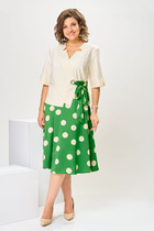 Лиф из жаккарда, горловина круглая с декоративным элементом по центру, по низу лифа ответная складка, по переду низ асимметричный, рукава втачные, по низу декоративный элемент с пуговицей.