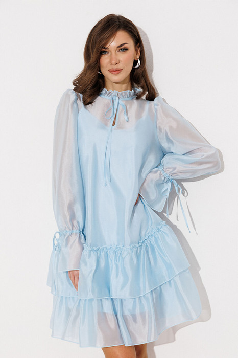 Платье А-силуэта, состоящее из 2-х слоев. Верхний слой: втачной длинный рукав со сборкой по окату и внизу на завязке, полочка и спинка с притачными слегка присборенным воланом с рюшей, воротник стойка-рюша и вырезом каплей по переду на завязке. Нижний слой: платье на бретелях с вытачками по переду на груди.