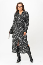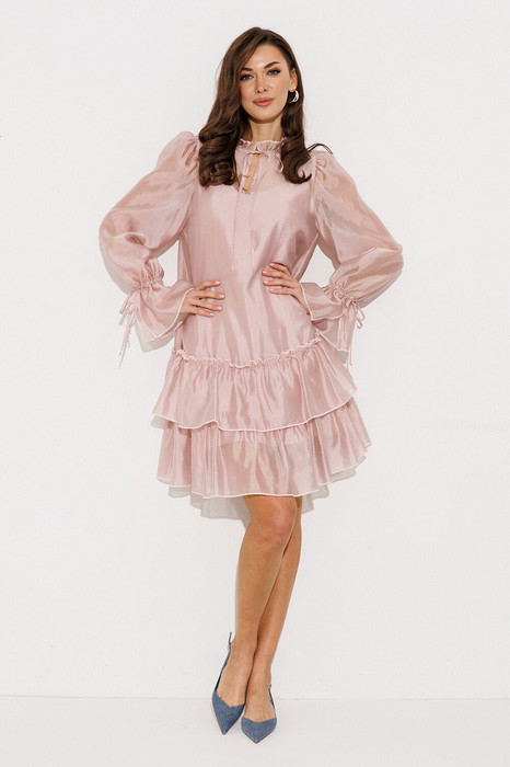 Платье А-силуэта, состоящее из 2-х слоев. Верхний слой: втачной длинный рукав со сборкой по окату и внизу на завязке, полочка и спинка с притачными слегка присборенным воланом с рюшей, воротник стойка-рюша и вырезом каплей по переду на завязке. Нижний слой: платье на бретелях с вытачками по переду на груди.