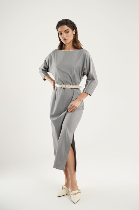 Классическое платье полуприлегающего силуэта с цельнокроеным рукавом. Вырез горловины - лодочка, с отделочным кантом по горловине и рукаву. Застежка на потайную молнию. Платье отрезное по линии талии, с складками по лифу платья и выточками по юбке. В боковом шве - разрез. Изделие дополнено съемным поясом. Длина по среднему шву спинки - 123 см, длина рукава от горловины - 49 см.