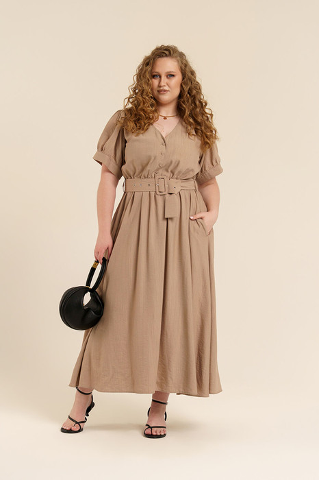 Платье женское приталенного силуэта из вискозной ткани. Вырез горловины- углубленный V-образной формы. Застежка-на петли с пуговицами. Рукава- втачные со сборкой внизу и в области оката. Низ рукава посажен на манжет. По линии талии проложена эластичная тесьма. В боковых швах имеются карманы. Изделие дополнено съемным поясом из основной ткани. Пуговицы и пряжка обтянуты тканью.