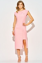 Платье женское приталенного силуэта из костюмной ткани. Вырез горловины оформлен воротником рубашечного типа. Застежка - потайная на петли с пуговицами. Рукава - втачные с мягкой складкой в области оката. Низа посажены на отрезные манжеты с застежкой на петли с пуговицами. Отрезное по линии талии. В боковых швах имеются карманы. Справа выполнен разрез, слева - складки. Изделие декорировано съемной баской.