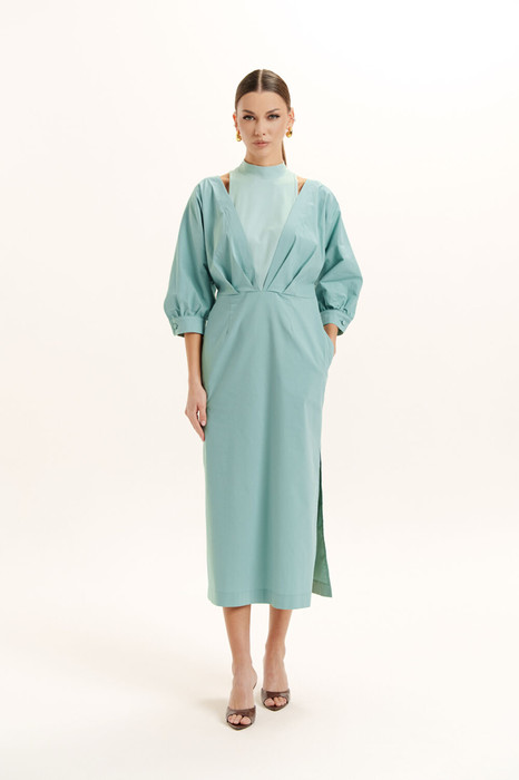 Красивое, стильное и элегантное платье прямого силуэта выполнено из хлопкового полотна и элит трикотажа. Модель платья классика с рукавом 3/4 ЛЕТУЧАЯ МЫШЬ, низ рукава на манжете. Горловина оформлена воротником - стойка из отделочной ткани с застежкой по спинке на потайную молнию , что делает платье универсальным нарядом в гардеробе любой женщины или девушки. На платье обработан подрез со складками. По боковому шву разрез.