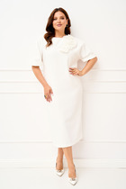 Платье женское полуприлегающего силуэта. Спинка со средним швом. Перед отрезной по линии талии. Верхняя часть с 2-мя мягкими складками, нижняя часть с запахом и 4-мя мягкими складками. Полы запаха округлой формы. В области складок декор-пряжка. Горловина круглая, сзади застегивается на петлю и пуговицу. Рукав втачной, одношовный с локтевой вытачкой. Фурнитура может отличаться от заявленной на фото.