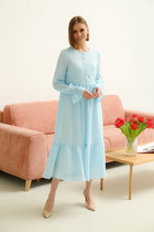 Края настрочных воланов, низа платья и низа рукавов обработаны спец машиной-улитка.