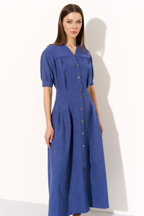 Платье женское полуприлегающего силуэта из легкого джинса цвета индиго. По верхнему срезу лифа выполнена сборка. По нижнему срезу лифа и по верхнему срезу юбки заложены складки. По линии талии имитация пояса. В боковых швах юбки обработаны карманы. Низ юбки обметан и подшит. Застежка на притачную планку с пробивными кнопками. Рукав втачной со сборкой, короткий. Низ рукава обработан манжетой.