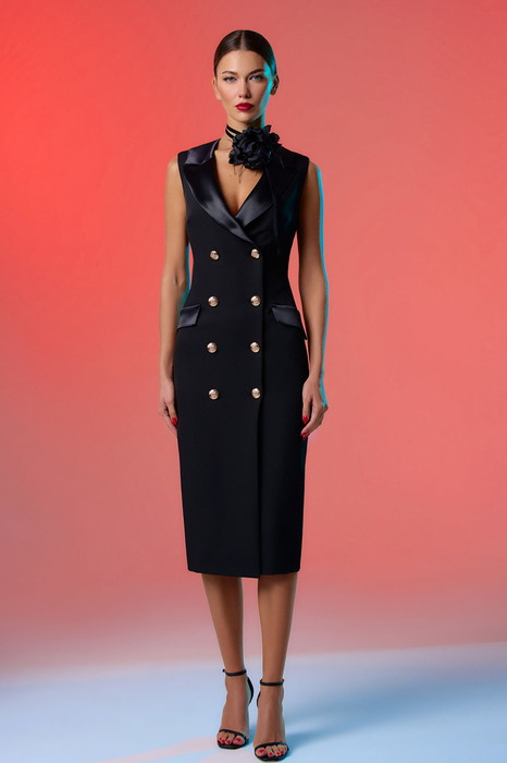 Платье женское полуприлегающего силуэта из платьево-костюмной ткани. Смещённые рельефы с нагрудными вытачками выходят из проймы, переходят в подрез ниже линии талии. Шов закрывают нашивные клапаны из атласа. Спинка с талевыми вытачками и средним швом. Воротник пиджачного типа с отрезными лацканами из атласа, воротник стояче отложной из атласа. Застёжка центральная, двубортная, на петли пуговицы в два ряда. Пройма обработана обтачкой.