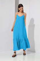 Платье женское полуприлегающего силуэта из платьево-костюмной ткани. Смещённые рельефы с нагрудными вытачками выходят из проймы, переходят в подрез ниже линии талии. Шов закрывают нашивные клапаны из атласа. Спинка с талевыми вытачками и средним швом. Воротник пиджачного типа с отрезными лацканами из атласа, воротник стояче отложной из атласа. Застёжка центральная, двубортная, на петли пуговицы в два ряда. Пройма обработана обтачкой.
