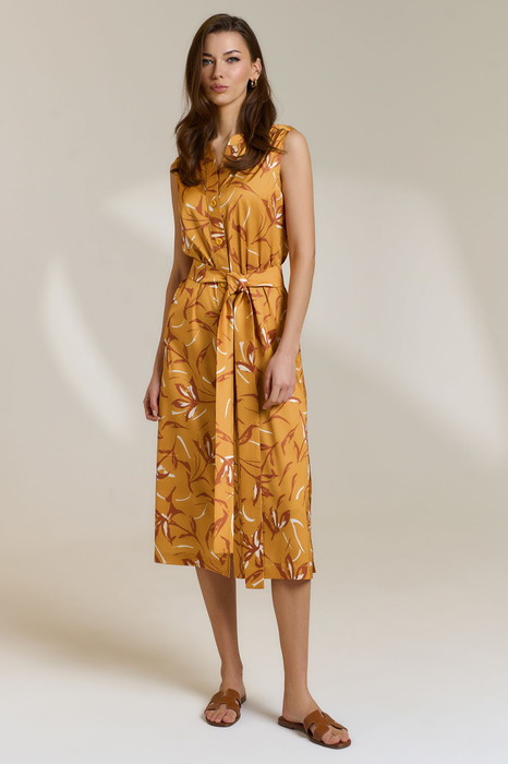 Платье женское приталенного силуэта со сьемным поясом из основной ткани. По спинке кокетка. Воротник - стойка. По переду притачные планки. В боковых швах разрезы до середины бедра. Застежка на пробивные петли и притачные пуговицы.