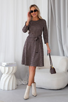 Платье женские А-образного силуэта с втачным одношевным длинным рукавом и воланом на резинке. Спинка со средним швом и декоративнымискладками, застроченными в верхней части. Перед с отрезной кокеткой-погон. Вырез горловины Y-образный с декоративной фигурной планкой с завязкой, перед со средним швом, декоративными складками по бокам так же застроченны сверху. В боковых швах карманы. Низ платья с притачной планкой и контрастной нашивкой.