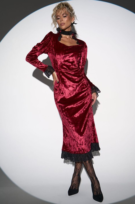 Бархатное платье— воплощение элегантности и утончённости. Мягкая, роскошная текстура бархата нежно обнимает силуэт, подчеркивая каждый изгиб и создавая эффект безупречной грации. Кружевные вставки изящно обрамляют фигурный вырез, добавляя романтический шарм.