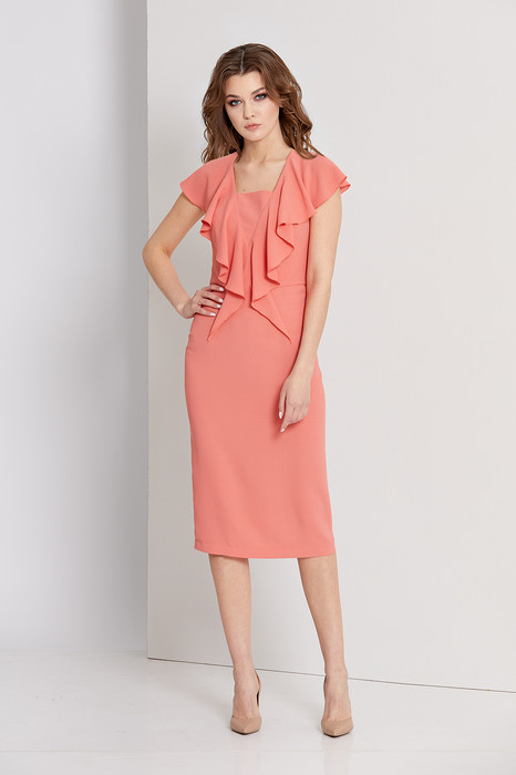 Платье выполнено из однотонной плательной ткани. Отрезное по линии талии, слегка заужено книзу. Застежка на потайную молнию в среднем шве спинки. Длина платья по центру спинки - 110 см.