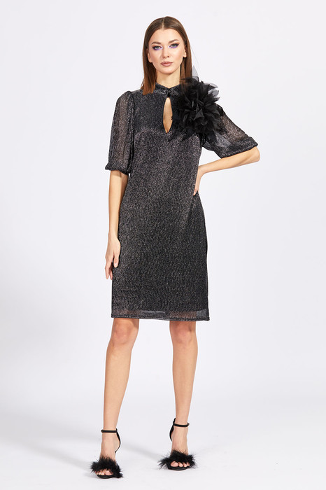 Платье выполнено из прозрачного трикотажного полотна с металлизированной нитью. Платье прямого силуэта, длиной выше линии колена. Перед и спинка цельные. Воротник-стойка, застегивающийся спереди на петлю и пуговицу Плечевой шов заужен. Рукав втачной, одношовный, длиной до линии локтя, со сборкой по окату. Платье на трикотажной подкладке.