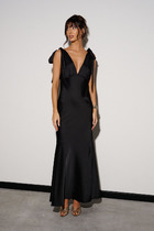 Платье выполнено из плательной ткани. Платье Х-образного силуэта, длиной миди, отрезное по линии талии. Горловина V-образной формы с завязками. На спинке в среднем шве застежка на потайную молнию. Плечевой шов укорочен. Рукав втачного покроя, одношовный, длиной 3/4 с вытачками по окату. Рукав расширен к низу, присборен на эластичную тесьму. Юбка расширена к низу. На заднем полотнище средний шов. В левом боковом шве обработан разрез.