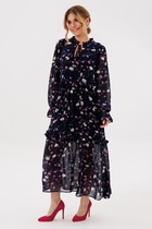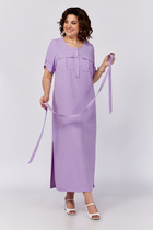 Платье выполнено из плательной ткани. Платье Х-образного силуэта. Центральная часть спинки собрана на венгерку. Рукав длиной до линии локтя, одношовный, расширенный. Верх и низ рукава обработаны эластичной тесьмой. Юбка расширена к низу. В боковых швах обработаны карманы. Юбка настрочена на лиф. Лиф платья на подкладке.