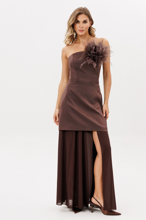 Платье выполнено из плотного атласа. Платье приталенного силуэта, отрезное по линии талии, длиной выше линии колена. Лиф выполнен в виде корсета, в рельефы вставлен регилин. Застежка на потайную молнию сзади в среднем шве спинки и юбки.  Юбка прямого силуэта. Платье на притачной по низу подкладке. Нижняя юбка в комплект НЕ ВХОДИТ и продается отдельно м.3003.