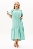 Платье женское прилегающего силуэта, выполнено из струящейся ткани, Вырез горловины - квадратный. Рукав приспущенный, короткий. Линии талии присборена на эластичную тесьму, по переду изделия глубокий разрез