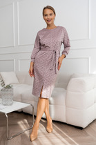 Платье женское выполнено в романтичном стиле, полуприлегающего кроя. Изделие отрезное по линии талии с регулирующей эластичной лентой в талии. Лиф платья свободного кроя с декоративными защипами и заложенными складками по талии и плечам. Рукав втачной приспущенный широкий с манжетой по низу. Юбка полусолнце с ассиметричным низом, в боковых швах юбки расположены фигурные карманы.