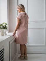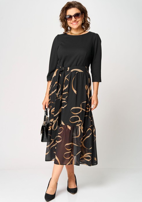 Платье женское нарядно-повседневное полуприлегающего силэта до талии. Выполненео из трикотажного полотна в сочетании с шифоном. Вырез горловины круглый на обтачке. По спинке застежка капелька на навесную петлю и пуговицу. Рукав втачной 7/8 по верху со встречной складкой. Платье отрезное по талии, верх из трикотажного полотна , низ платья юбка со сборкой. декором платья служит съемный пояс в цвет юбки.