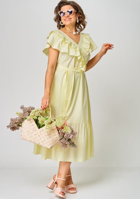 Платье женское нарядно-повседневное полуприлегающего силуэта до талии и расширенное к низу. Платье отрезное по линии талии, вырез горловины V-образный с ассиметричными рюшами из тканей двух дизайнов. Проймы обработаны обтчками. В боковых швах плать обработаны карманы, по низу притавчной волан из отделоной ткани(шитье). декором служит пояс из основной ткани.