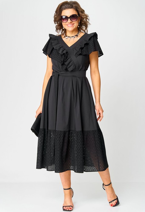 Платье женское нарядно-повседневное полуприлегающего силуэта до талии и расширенное к низу. Платье отрезное по линии талии, вырез горловины V-образный с ассиметричными рюшами из тканей двух дизайнов. Проймы обработаны обтчками. В боковых швах плать обработаны карманы, по низу притавчной волан из отделоной ткани(шитье). декором служит пояс из основной ткани.