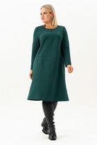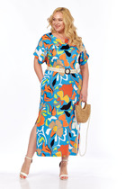 Платье женское нарядно-повседневное полуприлегающего силуэта расширенное к низу. Выполнено из хлопка. .Вырез горловины фигурный, воротник на стойке с фигурным вырезом. Рукав спущенный из отделочной ткани по низу с воланом собранным на сборку. Платье отрезное по лиии талии. Юбка ассиметричная с застежкой доверху на обметанные петли и пуговицы на подкладке. По низу юбки притачной волан из основной ткани. Декором платья служит дизайн ткани, съемный пояс из основной ткани и отделочные пуговицы.