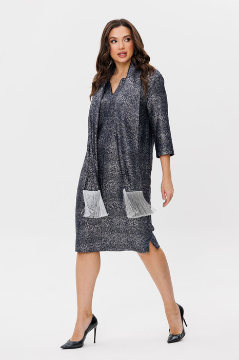 Серебренное напыление поддержанное эффектной бахромой, в лаконичном платье "шифт" длины миди, отличный выбор для праздничного настроения.