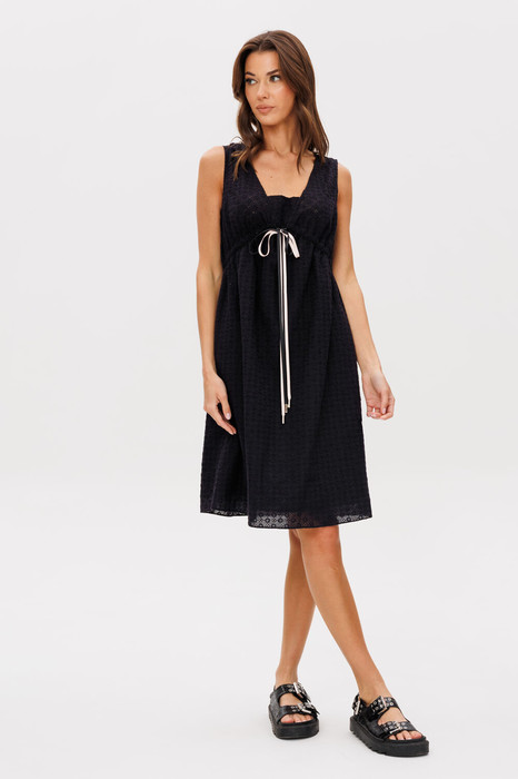 Интересная фактура полотна с геометрической вышивкой и необычный крой превращают простое платье в модель со знаком +. Свободный А-образный силуэт, изящный покрой выше линии талии, подтягивающаяся кулиса с завязкой и романтичный волан.