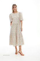 Благородный оттенок цвета сливочного масла, абстрактная цветная вышивка, полуприлегающий силуэт, вырез каре и центральная застежка на петли и пуговицы. Полочка с нагрудной вытачкой и прорезным карманом с кисточкой. Спинка с центральным швом, талиевой вытачкой и регулирующим талию хлястиком.