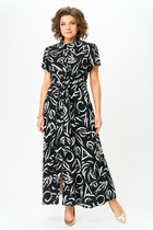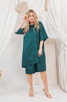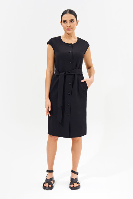 Женское классическое платье-халат полуприлегающего силуэта выполнено из легкой натуральной струящейся ткани "тенсель". По переду изделия накладные функциональные карманы, линия плеча немного спущена, застежка на петли и пуговицы. В комплекте съемный пояс из основной ткани.