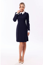 Платье прямого силуэта из плотного трикотажного полотна. Перед с нагрудными вытачками. Спинка со средним швом. Горловина лодочкой обработана планкой. Рукав одношовный втачной по низу со складками собранными на манжету-довяз.  Длина платья-100см, длина рукава-60см.