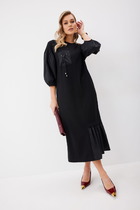 Платье расширенного к низу силуэта, с застежкой на потайную молнию в среднем шве спинки, без воротника, без рукавов, с круглым вырезом горловины. По переду с рельефами, выходящими из горловины до низа. Из рельефов выходят рюши. Спинка со средним швом, талиевыми вытачками.
