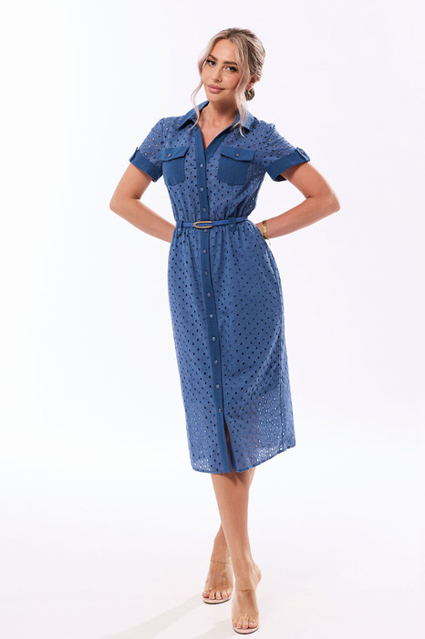 Платье, с отложным воротником, V-образным вырезом горловины, центральной застежкой на петли и пуговицы. По переду с накладными карманами и клапанами, расположенными на уровне груди. Платье отрезное по линии талии. Шов по талии присборен на резинку. По талиевому шву паты для сьемного пояса. По полочкам- отрезная планка. Рукав короткий, втачной, с отложной манжетой, зафиксированной к рукаву патой с петлей и пуговицей. Платье со съемным поясом.