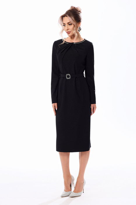 Платье без воротника, с фигурным вырезом горловины, застежкой на потайную молнию в среднем шве спинки. Платье отрезное по линии талии. По горловине переда фигурная драпировка со складками, горловина переда с отрезной планкой, декорированной тесьмой со стразами. Спинка со средним швом, заканчивающимся разрезом, талиевыми вытачками. Рукав втачной, длинный. Платье со съемным поясом.