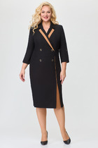 Платье с центральной застежкой на потайную молнию в среднем шве спинки, цельнокроенной стойкой с вытачками. Платье отрезное по линии талии. Верхняя часть переда с нагрудными вытачками. Верхняя часть спинки со средним швом. В боковых швах расположены карманы. Платье со съемным поясом.