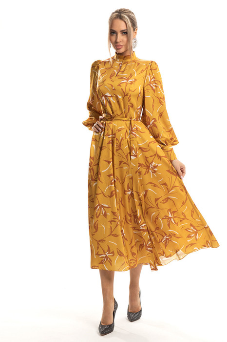 Платье с отрезной стойкой, застежкой на потайную молнию в среднем шве спинки, и на две навесные петли и пуговицы по стойке спинки. Платье отрезное по линии талии. Верхняя часть переда со средним швом, рельефами, выходящими из проймы. Нижняя часть переда и спинки состоит из четырех деталей. По окату и шву притачивания манжеты- сборка. Платье со съемным поясом.