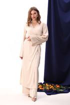 Платье без воротника, с круглым вырезом горловины, центральной застежкой на кнопки на отрезной планке. Перед с кокеткой, накладным карманом по верхней части переда. Спинка со средним швом, кокеткой. Из шва притачивания планки выходит пояс, фиксированный кнопками по спинке. Рукав втачной, длинный, с отрезной манжетой, двухшовный. В боковых швах расположены карманы.