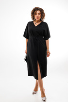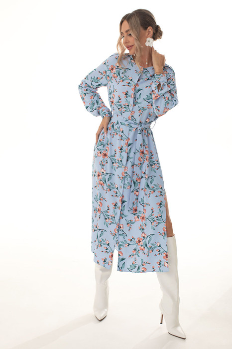 Платье с центральной застежкой на петли и пуговицы, без воротника, с круглым вырезом горловины. По боковым швам- разрезы. Плечевые швы переходящие на перед. По плечевым швам расположены паты, закрепленные петлей и пуговицей. Платье со съемным поясом, закрепленным шлевками по боковым швам. Рукав втачной, длинный, с отрезной манжетой.