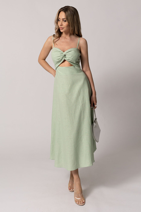 Платье на бретелях, без рукавов и воротника, с застежкой на потайную молнию в среднем шве спинки. Платье отрезное по линии талии. Лиф переда состоит из двух деталей, верхняя часть лифа с перекрученными деталями и отрезной нижней частью. Лиф спинки состоит из двух деталей, боковая деталь спинки присборена резинкой. Нижняя часть платья расклешенная.