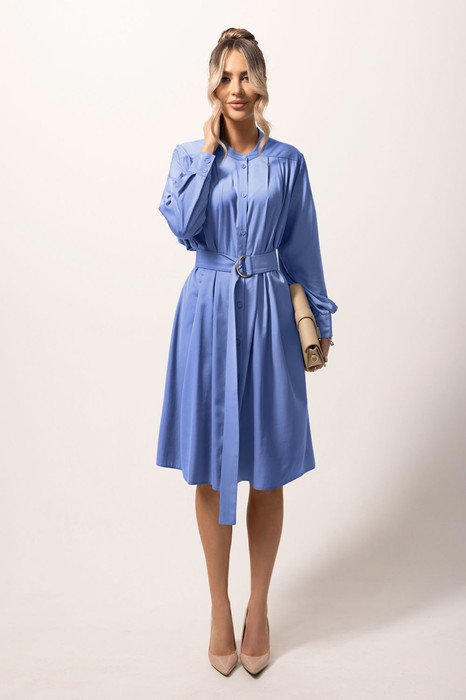 Платье свободного трапециевидного силуэта, с центральной застежкой на петли и пуговицы, с отрезной стойкой. Кокетка платья без плечевого шва. Полочки по шву притачивания кокетки с односторонними складками. Спинка по шву притачивания кокетки с встречной складкой. Платье со съемным поясом. Рукав втачной, длинный, с отрезной манжетой.